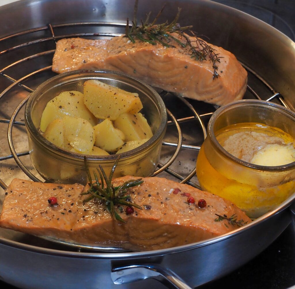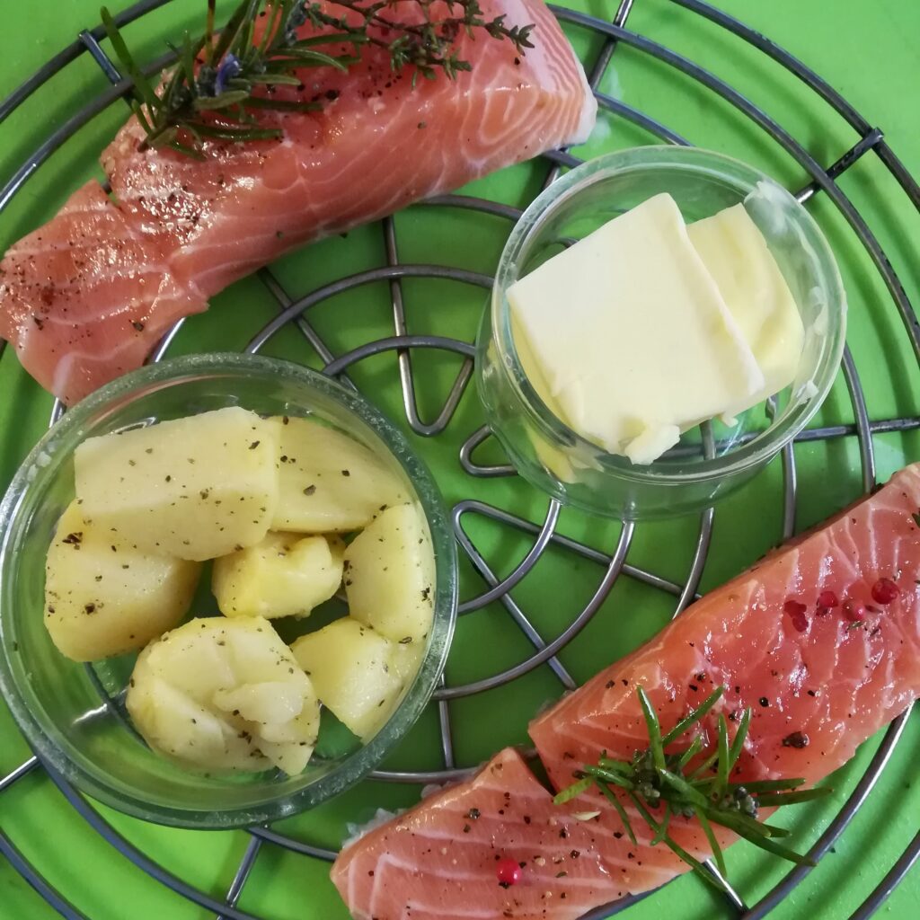 Zalig zalm: op het rooster: rauwe zalm, voorgekookte aardappeltjes en boter. De zalm is bestoken met verse rozemarijn, subtiel bestrooid met specerijen, rode peper en Perzisch zout.