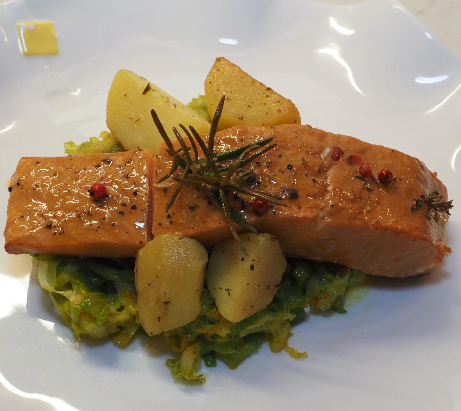 Zalig: zalm gerookt, bestreken met gerookte boter en geserveerd met gerookte aardappeltjes en prei gestoofd met vanille.